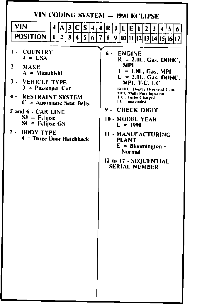 This bulletin contains information to decode the Vehicle Identification Number on the 1990 Eclipse. As additional 1990 models are released, they will be covered in future technical bulletins.