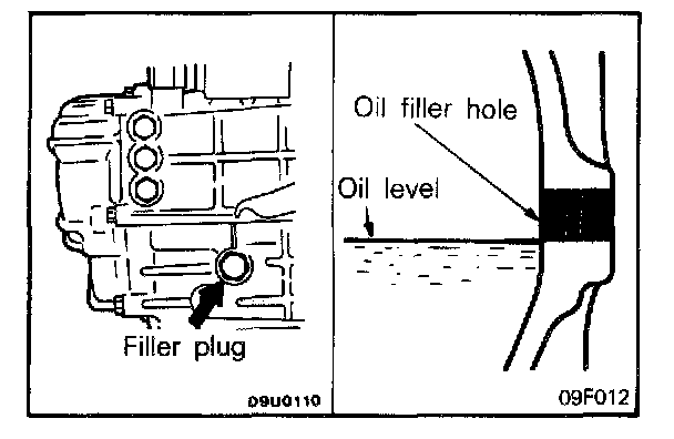 3. Refill the transaxle to the proper level with specified transaxle oil. The oil level should be the bottom of the oil filler hole.