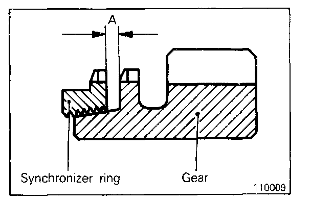 - Force the synchronizer ring toward the clutch gear and check clearance "A". Replace if it is out of specification.