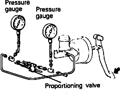 3. Depress brake pedal, check that measured values are within specifications as shown in SPECIFICATIONS/PRESSURES, VACUUM, AND TEMPERATURE SPECIFICATIONS/PROPORTIONING VALVE SPECIFICATIONS.