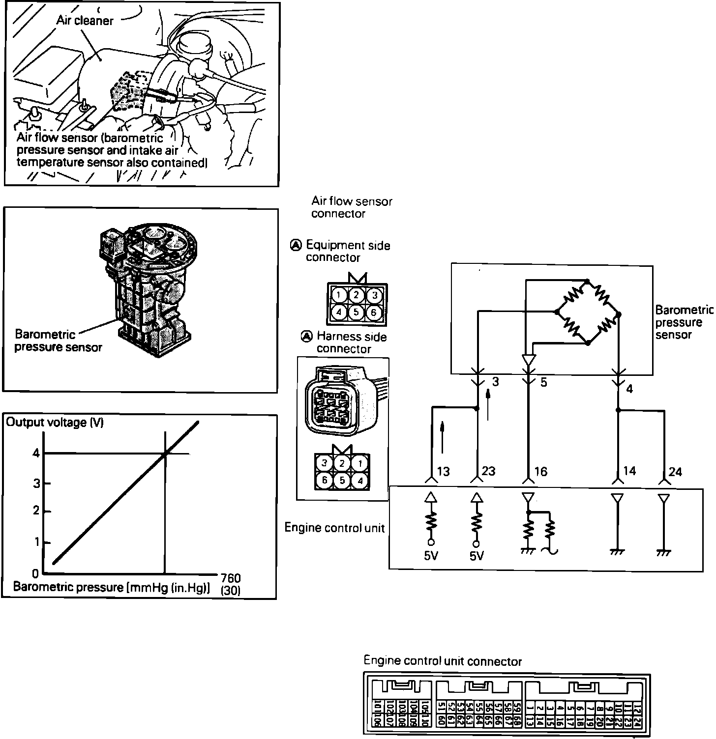 The Barometric Pressure Sensor, located in the Air Flow Sensor (AFS), senses the atmospheric pressure and converts it into a voltage which is sent to the ECU. The ECU uses this signal to compute the altitude at which the vehicle is running, accordingly correcting the air-fuel ratio and the ignition timing, thus improving driveability at high altitude.