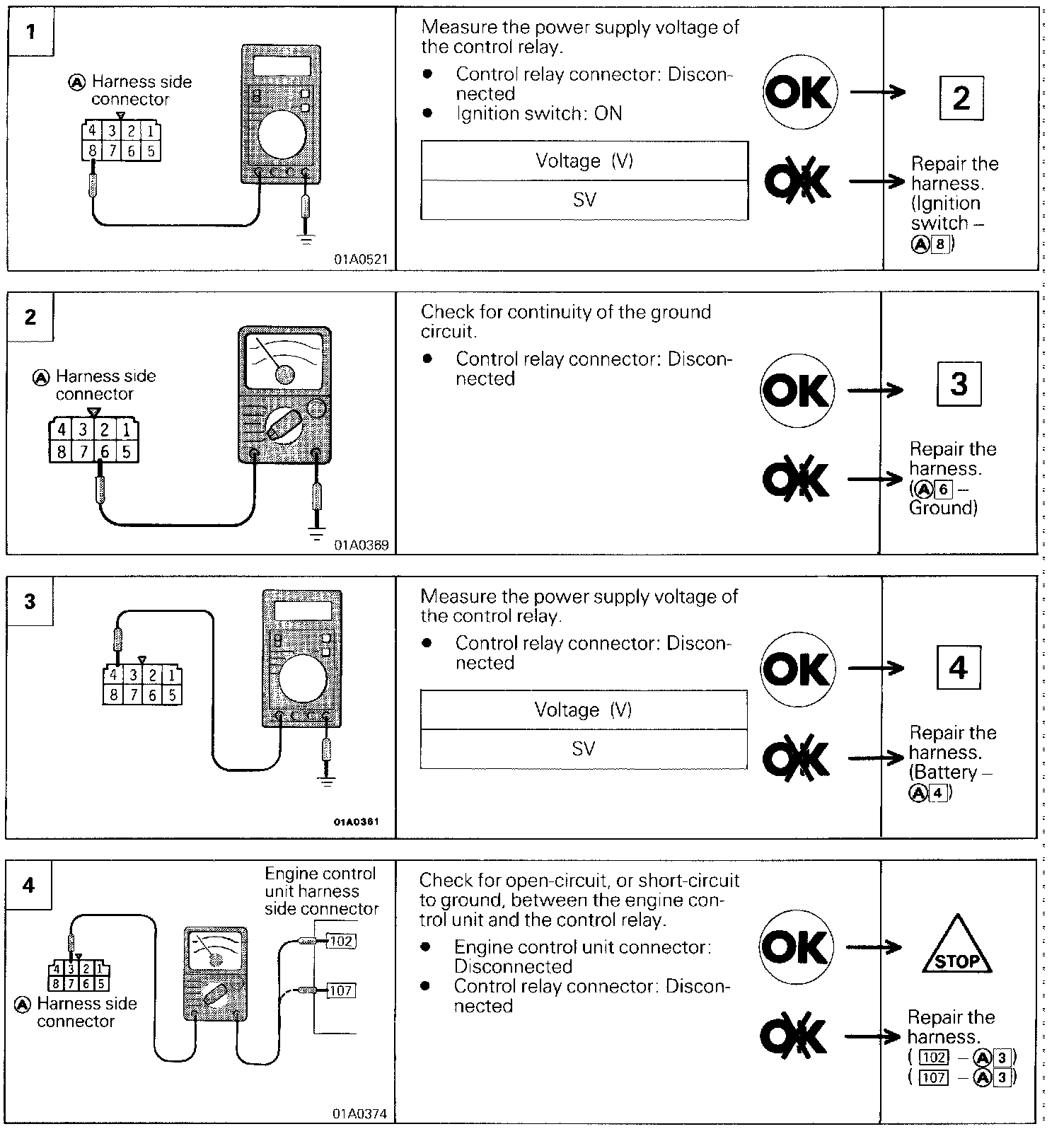 ^ When the ignition switch is turned on, current flows from the ignition switch through the control relay coil to ground. This turns on the control relay switch and power is supplied from the battery through the control relay switch to the engine control unit.