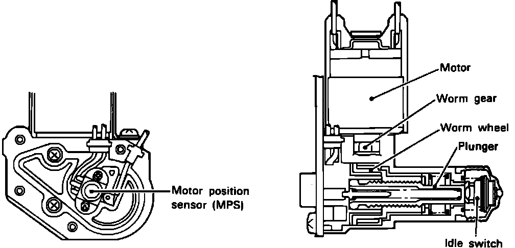 The ISC servo consists of a motor, worm gear, worm wheel and plunger. A motor position sensor (MPS) is used to detect plunger position, and an idle switch is used to detect idle position. The worm wheel (attached to the motor shaft) is meshed with the worm gear on the plunger. As the motor rotates, according to the signal from the ECU, the plunger extends or retracts. This actuates the throttle valve via the ISC lever. In this way, the idle speed is controlled by changing the throttle valve opening.