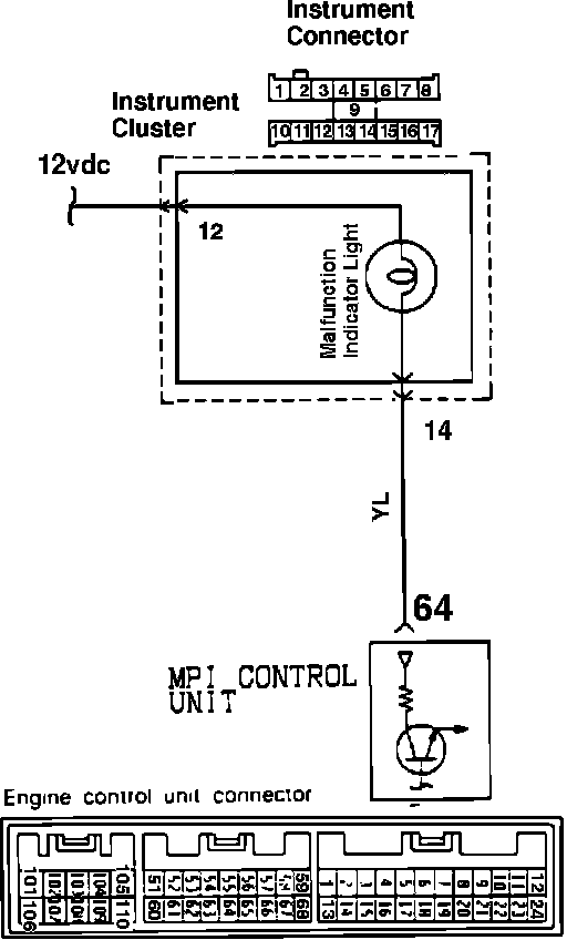 To test the Check Engine Light, located in the instrument cluster, turn the ignition switch on. The light should illuminate. This insures that the light is operative. If the light bulb does not illuminate the most likely fault is a defective light bulb. If the light tests good the other possible causes are, the ECU not supplying ground at terminal 64, the wiring harness or instrument cluster printed circuit board.