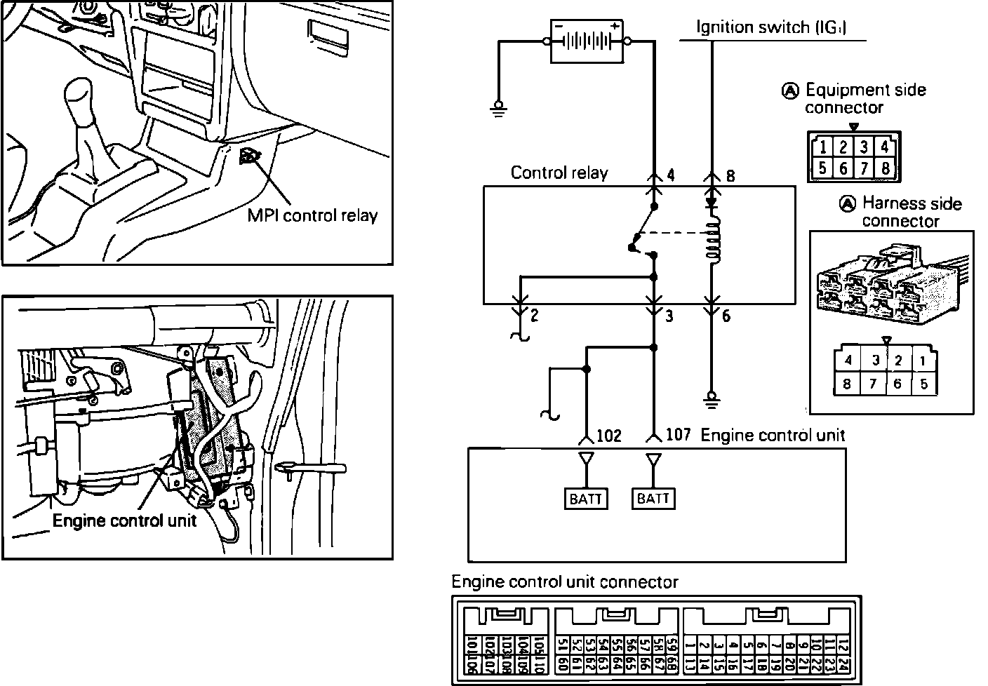 7. Using an ohm meter check for continuity between relay harness connector 3 and ECU harness connectors 107 and 102.