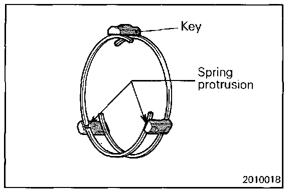 Install the synchronizer spring so that its protrusion fits into the groove in the synchronizer key. Make sure that the protrusions in the front and rear springs are not in the groove of the same key.