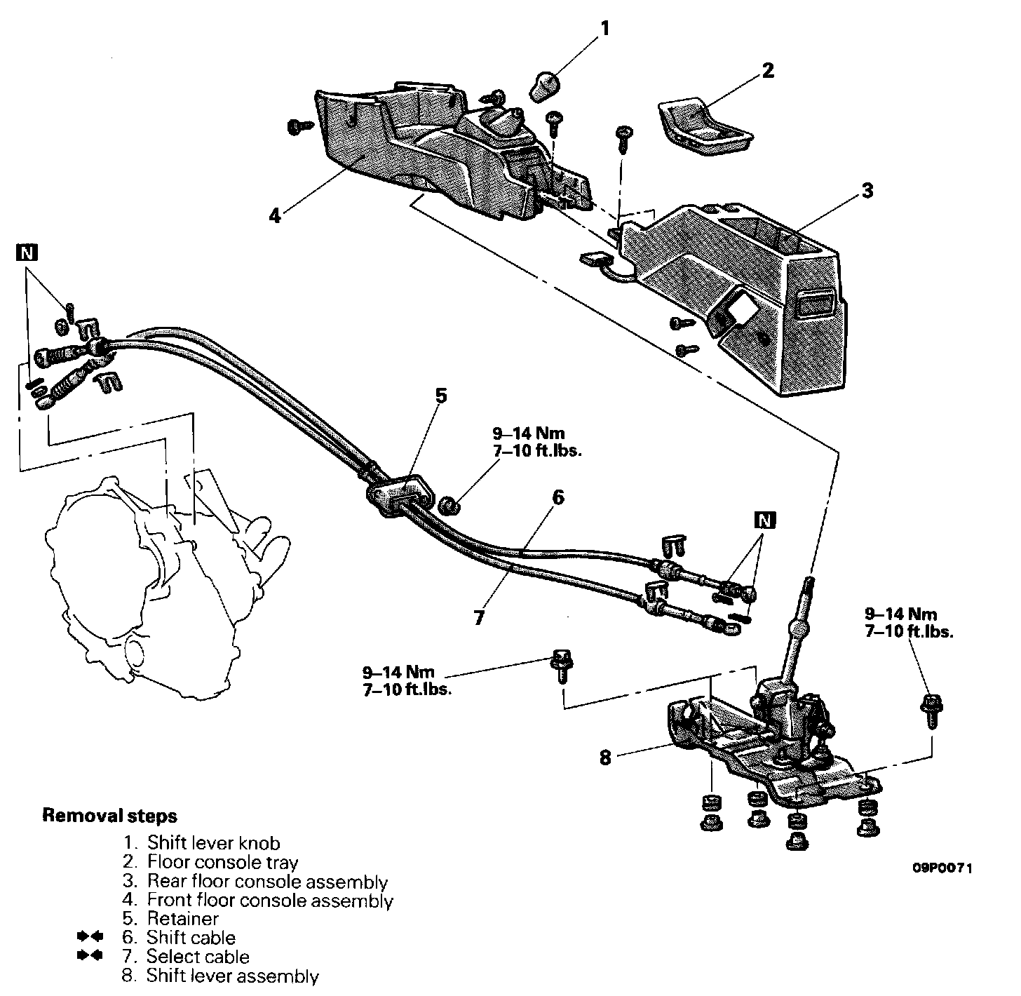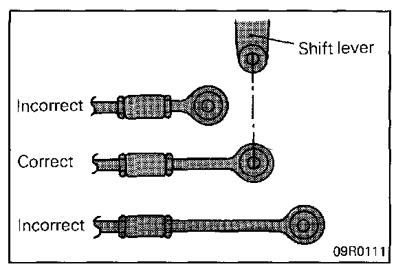 3. Use the adjuster to bring the shift cable end to the illustrated position with respect to the passenger compartment side shift lever.