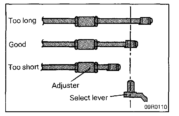 3. Use the adjuster to bring the select cable end to the illustrated position with respect to the passenger compartment side select lever.