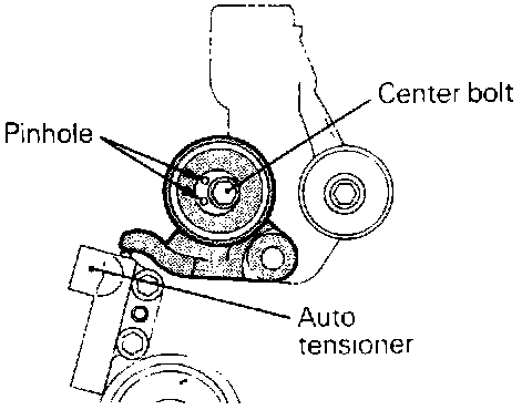 (2) Locate the pinhole in the tensioner pulley shaft to the left of the center bolt. Then, tighten the center bolt finger-tight.