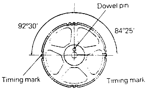 (1) Turn the two sprockets so that their dowel pins are located on top. Then, align the timing marks facing each other with the top surface of the cylinder head. When you let go of the exhaust camshaft sprocket, it will rotate one tooth in the counter-clockwise direction. This should be taken into account when installing the timing belt on the sprockets.