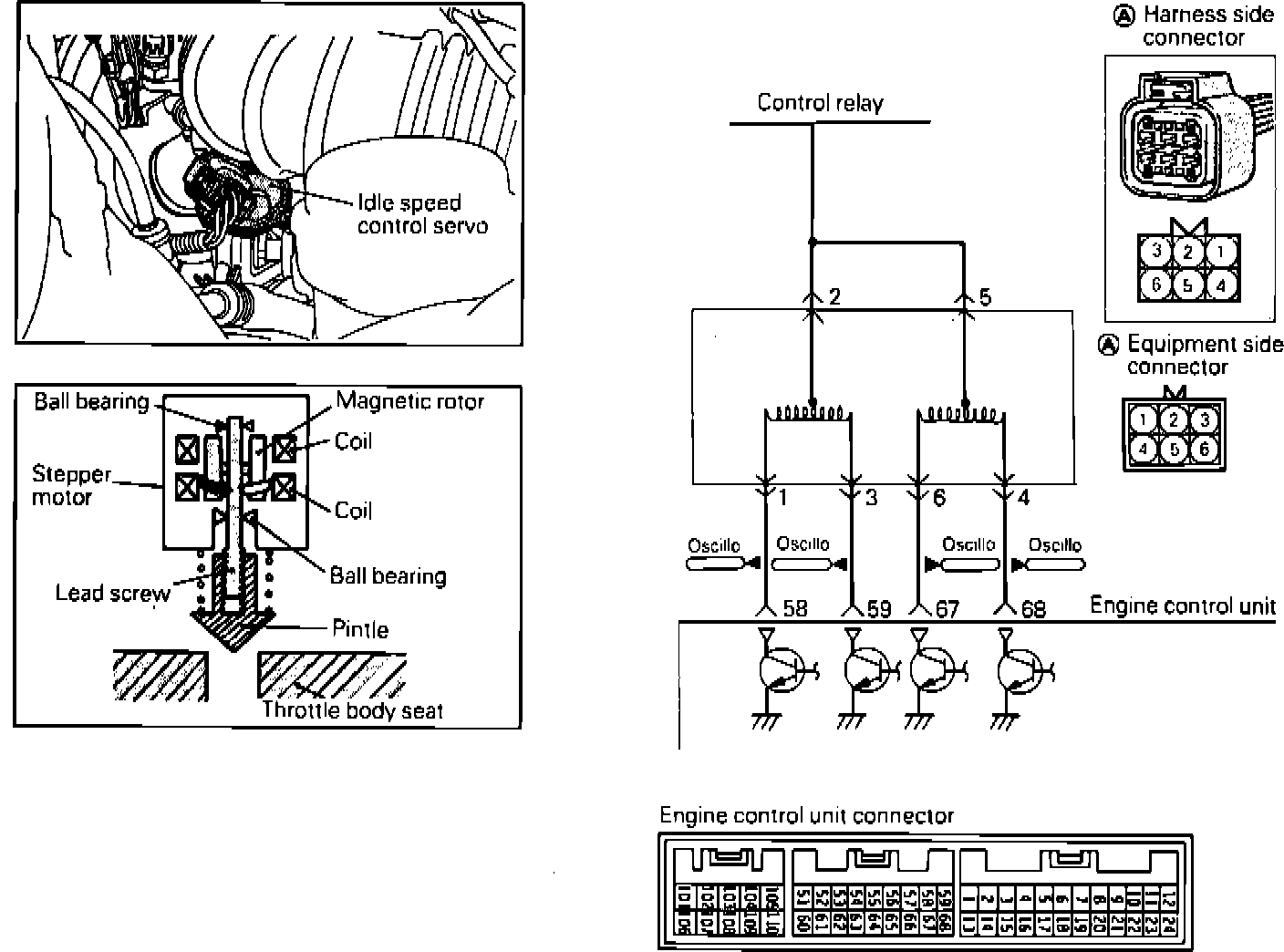The ISC servo is a stepper motor that regulates the amount of air taken in through the bypass circuit of the intake manifold by opening and closing the servo valve located in the air passage. The ECU will supply voltage in one polarity direction, which will turn the motor in a particular rotation. Connected to this motor's shaft is a screw that when turned, either opens the passage or closes the passage (depending upon rotation) by moving the pintle. When the ECU reverses polarity, the passage is closed in the same manner.