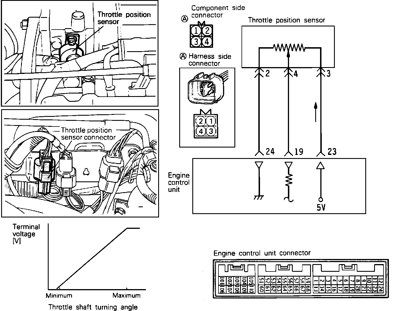 2. Using a high-impedance digital voltmeter, carefully back probe the throttle position connector into terminals #2 and #4. Refer to the connector in the image.