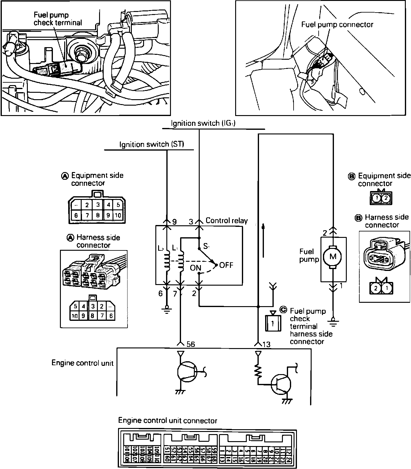 3. Disconnect the ECU connector and the control relay connector. Using an Ohmmeter, check for continuity between the ECU harness connector terminal 13 and the control relay harness connector terminal 2.