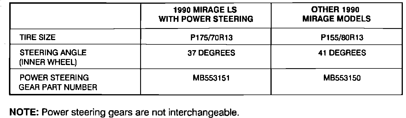 1990 Mirage LS vehicles with power steering come equipped with P175/70R13 tires. These tires are slightly wider than tires used on other 1990 Mirage models. These wider tires require a reduced steering angle in order to provide clearance between tires and body components during tight turns. The steering angle reduction is accomplished by using a different power steering gear and linkage assembly. The table below shows the different steering angles and the power steering and linkage assemblies used. Refer to this Technical Service Bulletin when servicing the power steering on 1990 Mirage models.