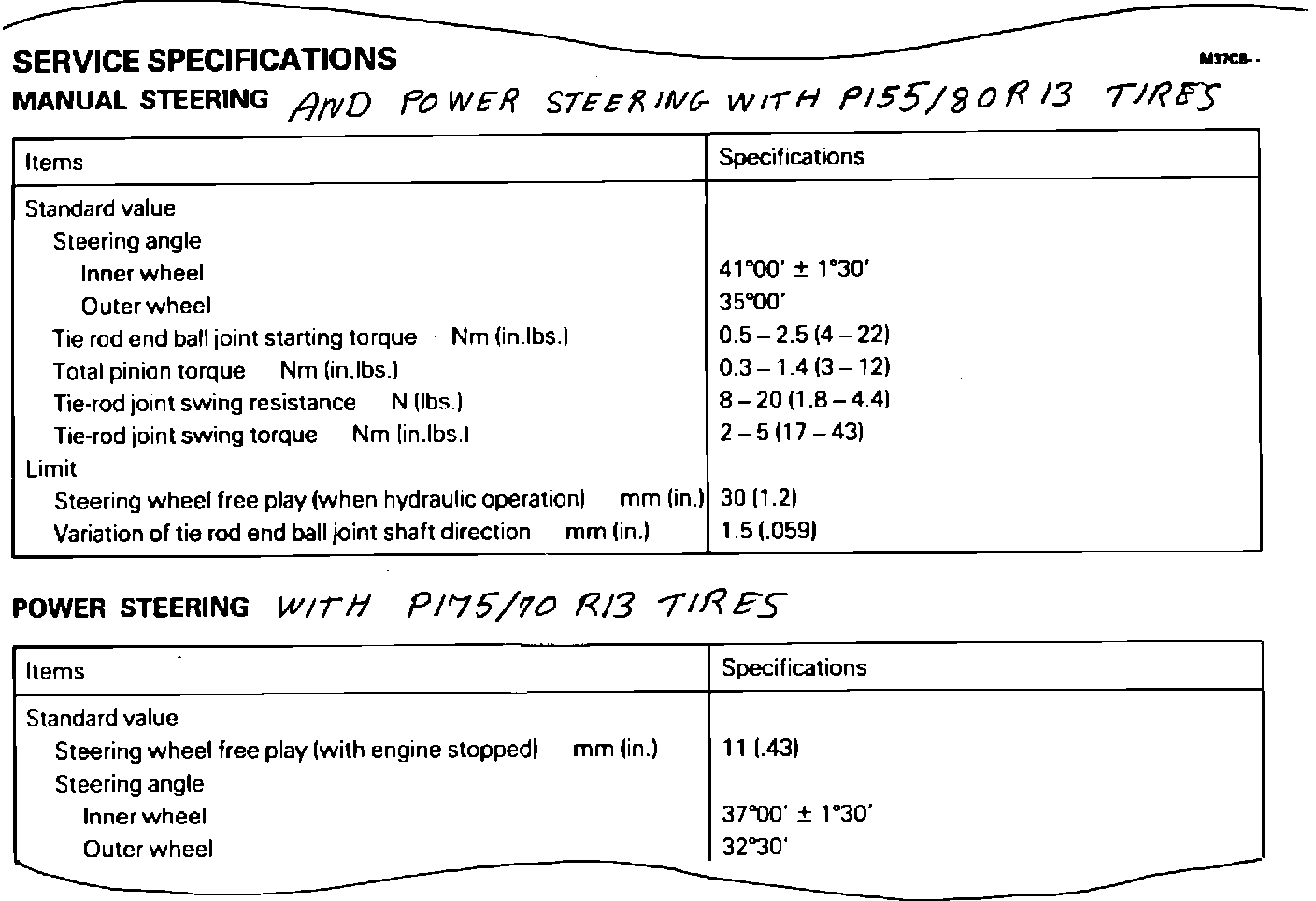 Please write in next to Manual Steering "AND POWER STEERING WITH P155/80R13 TIRES" and next to Power Steering please write "WITH P175/70R13 TIRES."