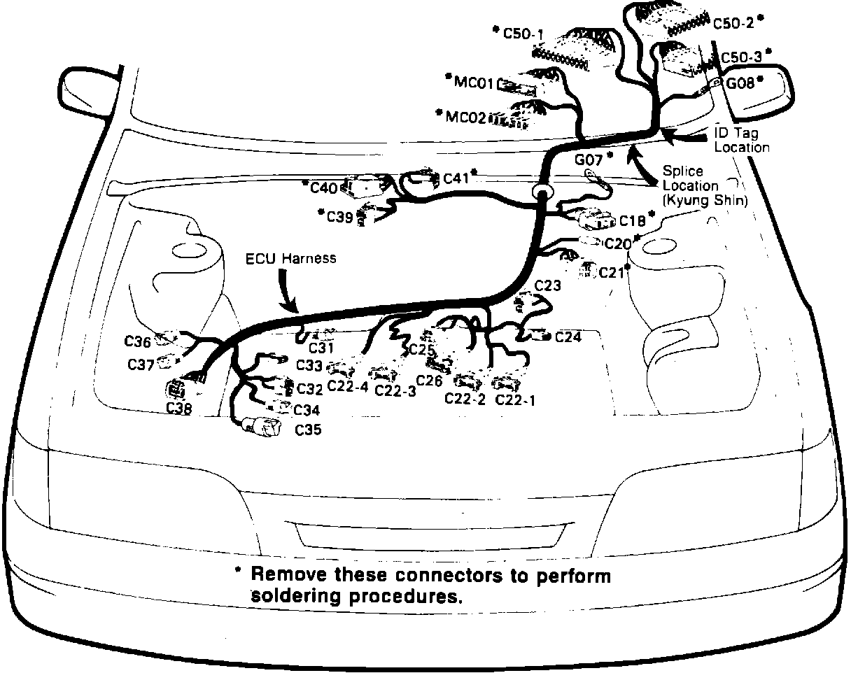 2. Referring to Figure 4, disconnect the following ECU wiring harness connectors and ground wires located underneath the driver's side of the dash-board: Connectors C50-1, C50-2, C50-3; Ground Wire G08; and Connectors MC01, MC02.