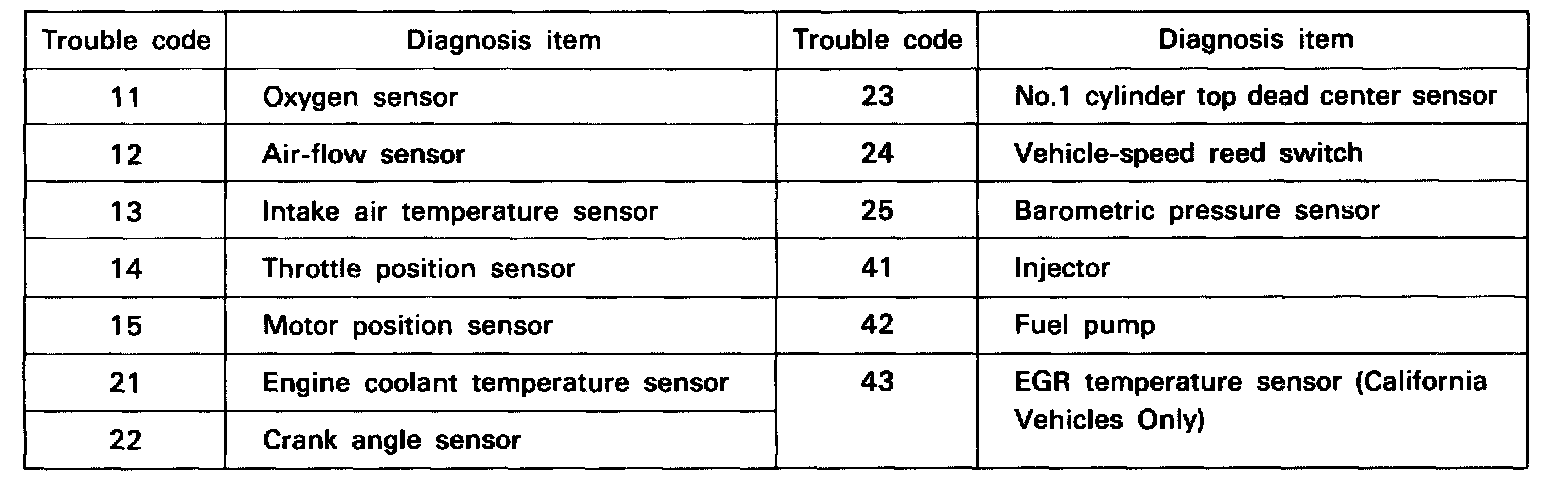 There are 14 diagnosis codes, including the normal code, that can be read out with a voltmeter or the multi-use tester. The diagnosis codes are memorized even if the ignition key is turned off. The trouble codes will, however, be erased when the battery terminal or the electronic control unit harness is disconnected.