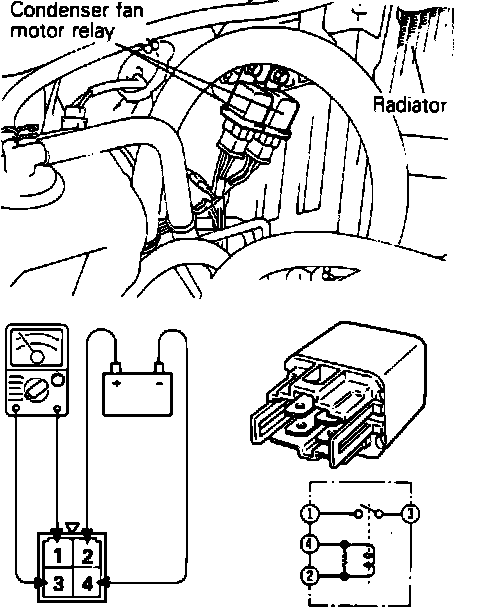 1. With radiator fan relay disconnected, use suitable ohmmeter to check for continuity between terminals 2 and 4 Fig. 18, continuity should exist. Check for continuity between terminals 1 and 3, continuity should not exist.