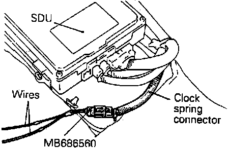 3. Connect two wires each 20 feet long to the two leads of the SRS airbag adapter harness B No. MB628919 and cover the connections with tape. The other ends of the two wires should be connected to each other to prevent unexpected deployment of the airbag.