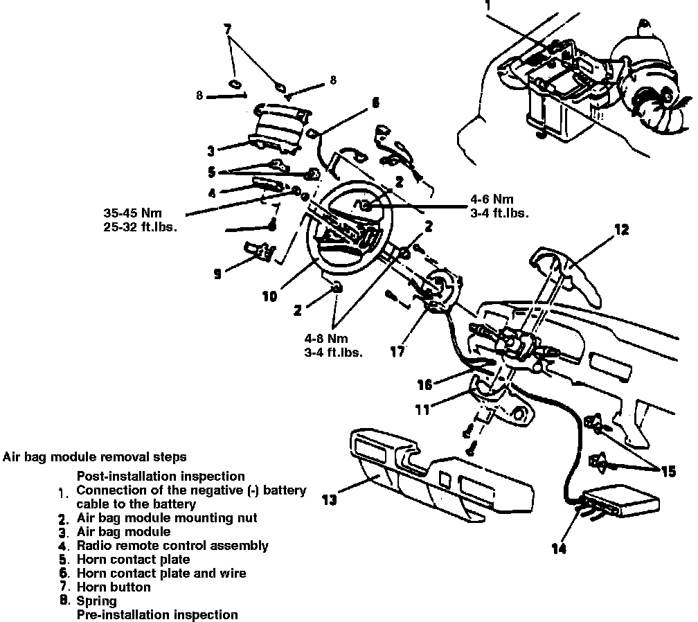 - After installing clock spring, steering wheel, column covers and airbag module, check steering for noise, binds or difficult operation.