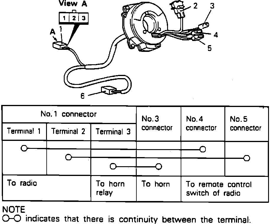 c. Check for continuity between the No. 1 connector of the clock spring and connectors Nos. 3, 4, 5 and 6. Refer to Fig. 17.