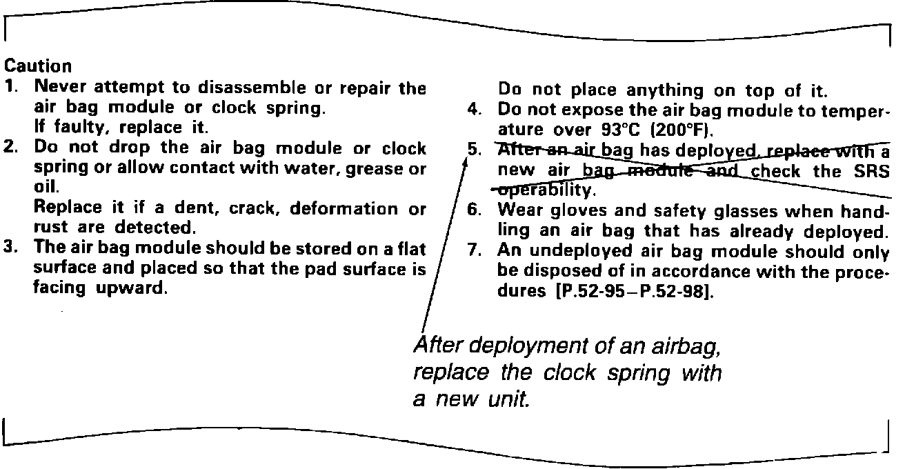 As shown, please cross out step 5 and write in "After deployment of an air bag, replace the clock spring with a new unit." Draw arrows as needed.