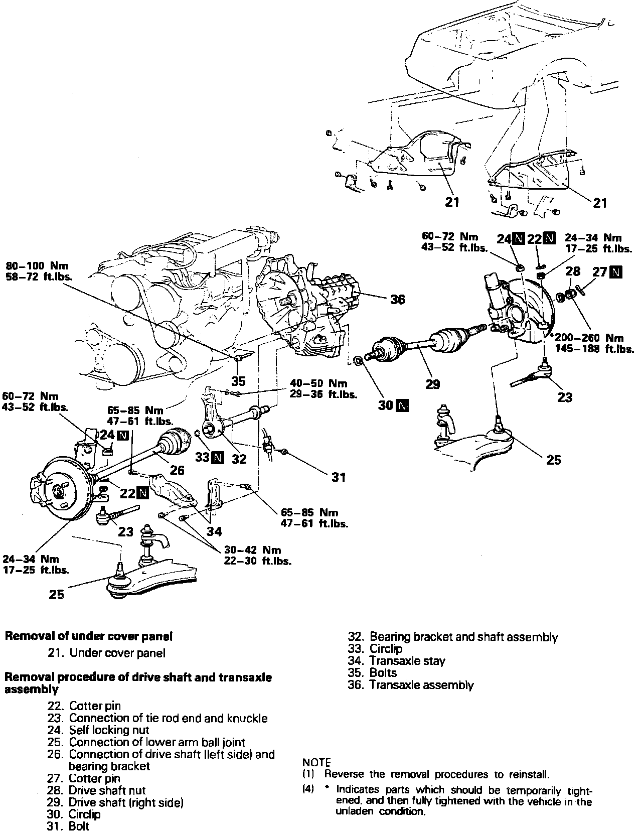 e. Use a pry bar to remove lefthand side driveshaft (26) from bearing bracket, then suspend it with wire.