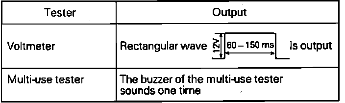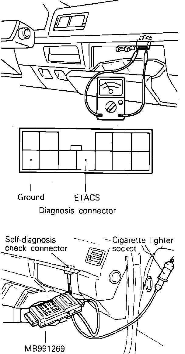 With glove compartment open, connect a voltmeter or multi-use tester between the ETACS terminal and ground as shown in Fig. 8. Ensure voltage output is present with ignition switch in ``OFF'' position and door switch ``ON'' when each sensor or switch is operated. If there is no output of a voltage pattern, or buzzer does not sound, Fig 6, check for malfunction of switch or damaged or disconnected wiring.
