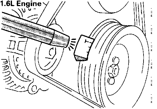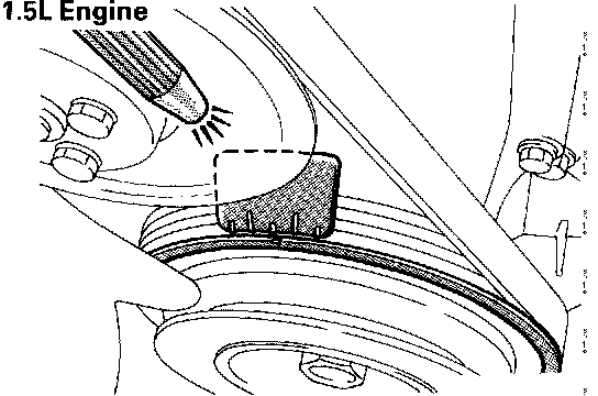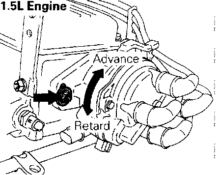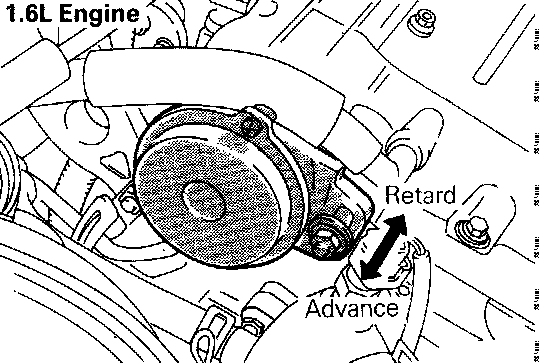 11. After adjustment, tighten the mounting nut while using care not to move the distributor (1.5L engine) or crank angle sensor (1.6L engine).
