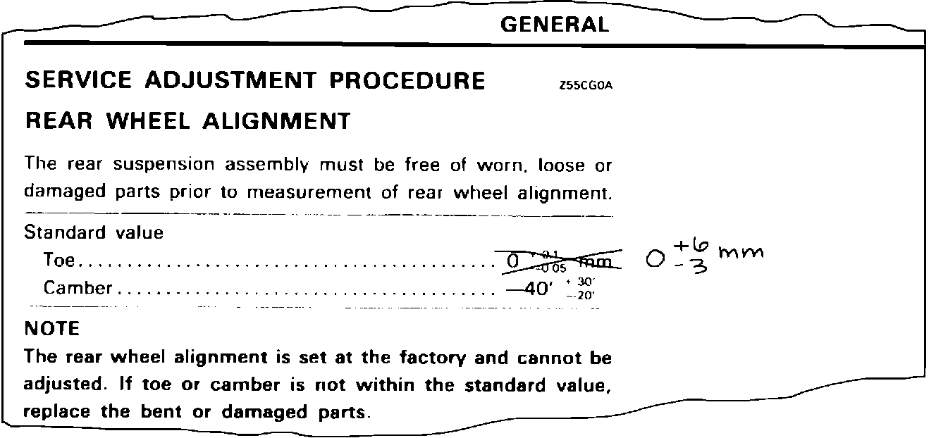 The new toe-in value for the rear wheels is 0 mm + 6 mm, - 3 mm.