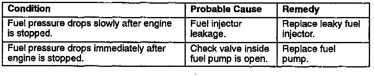 14. Stop the engine and check for a fuel pressure change. The fuel pressure should remain within 5 psi for approximately five minutes before dropping. If it does not, make the necessary parts replacement as determined by the table as shown: