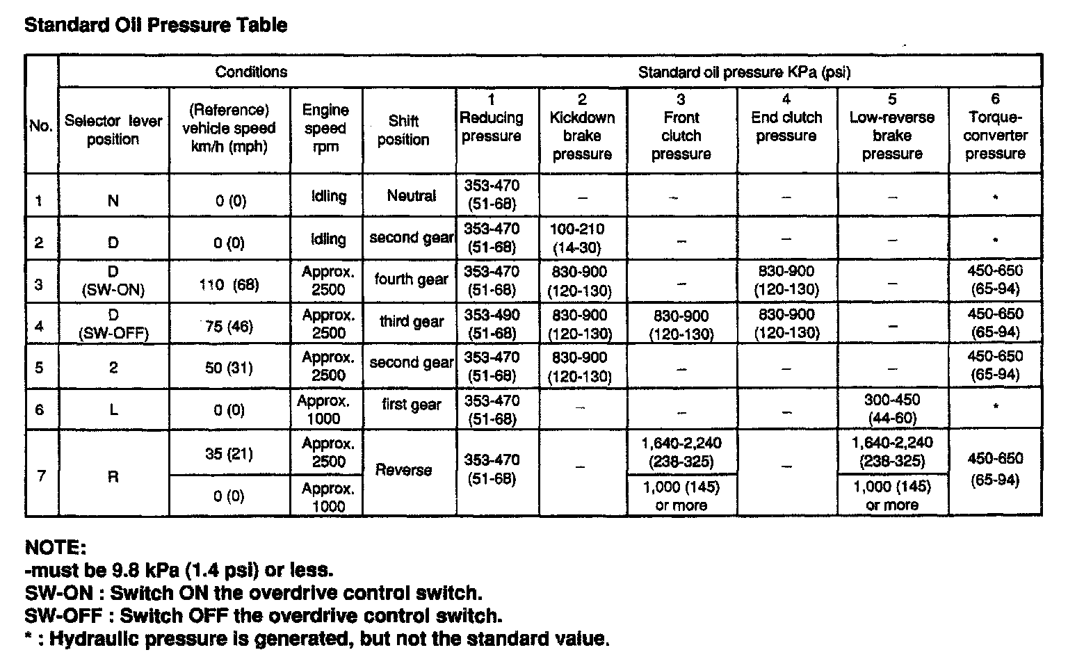 KM176 4-spd A/T, Standard Oil Pressure Table ('94):