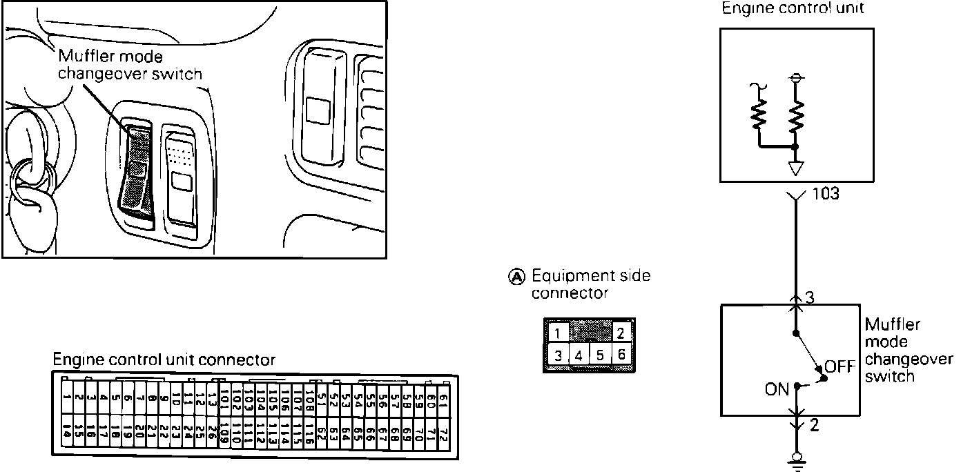 3. Using an Ohm meter, check for continuity between muffler mode changeover switch harness connector terminal 2 and ground.