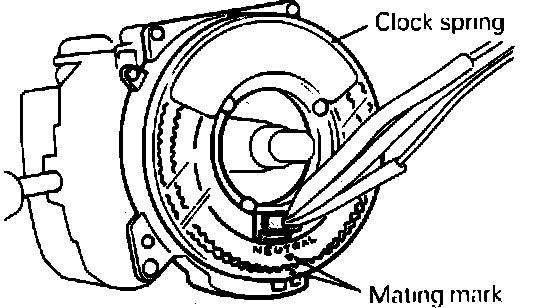 a. Line up the ``NEUTRAL'' mark of the clock spring with the mating mark to center clock spring, Fig. 12. If clock spring is not centered, problems such as intermediate failure of the steering wheel to turn or broken ribbon cable in the clock spring could occur. As a result, they might hinder proper operation of the SRS, resulting in serious injury.