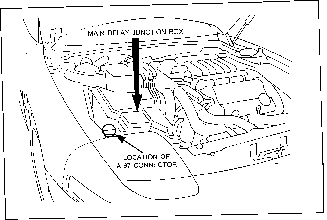 If a 1991 or 1992 3000GT cranks but does not start, the cause may be traced to corrosion in two wires of the A-67 connector. As indicated, the 12-pin A-67 connector is located behind the right-side headlight, next to the main relay junction box.