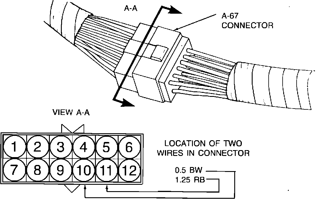 There are two wires in the A-67 connector subject to corrosion. One is the 0.5 BW (black wire with white tracer). The other is the 1.25 RB (red wire with black tracer). These two wires are located in the A-67 connector as shown.