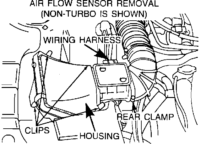 2. Loosen the air flow sensor rear clamp and the four air filter clips. Remove the air flow sensor wiring harness, air flow sensor housing, and air filter.