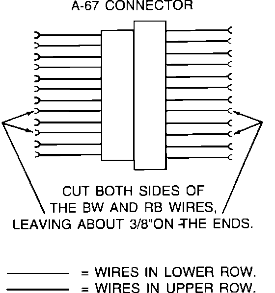 4. Disconnect the A-67 connector and locate the BW wire and RB wire. Refer to the wire identification illustration.