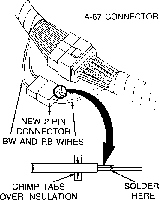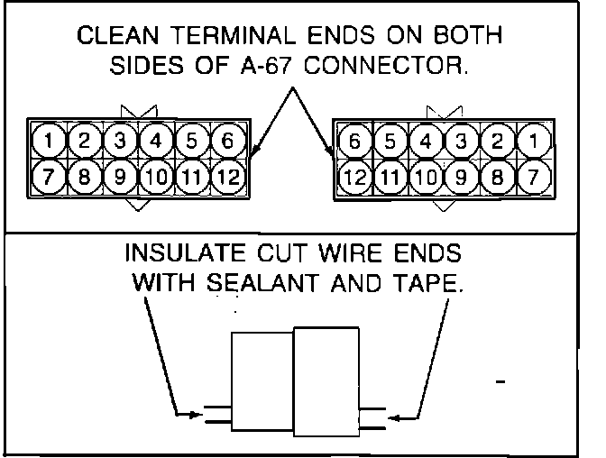 7. Before re-connecting the A-67 connector, clean out each terminal end using a point cleaner. To prevent future corrosion in the connector, insulate the two cut wire ends with silicone sealant and electrician's tape.
