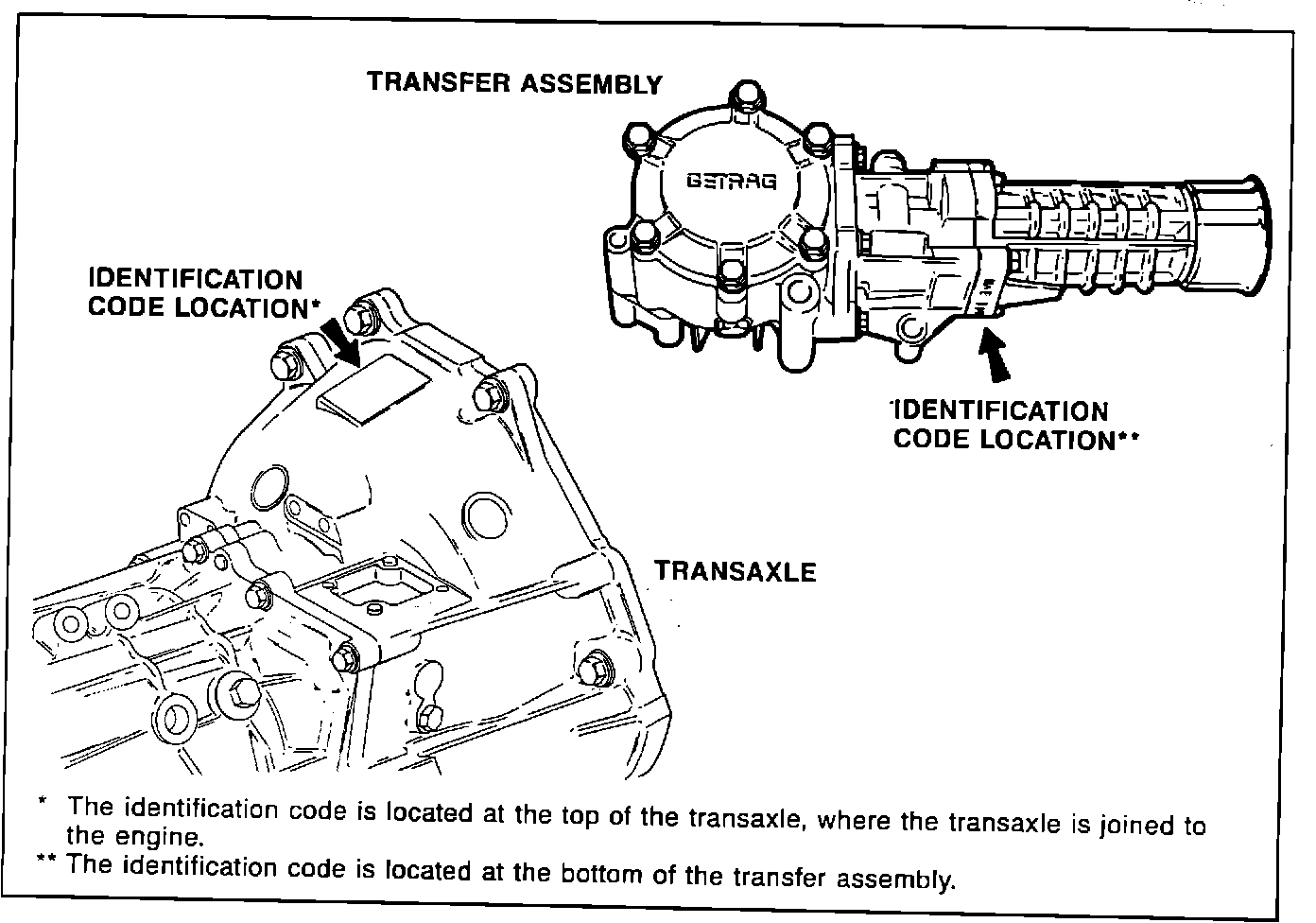 Since there may be a few late model transaxle and transfer assemblies installed prior to the above VIN, make sure to locate and identify both transaxle and transfer assembly identification codes before replacement procedures are performed.
