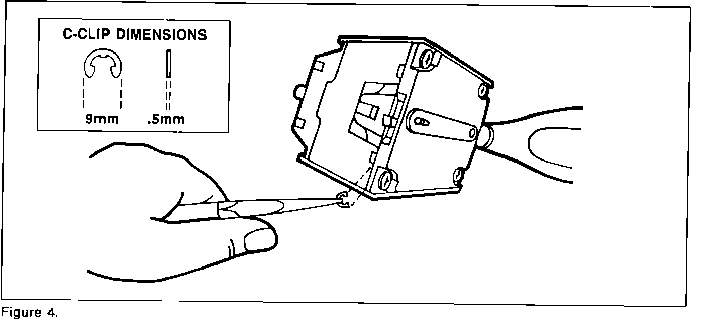 7. Insert one C-clip underneath each of the two loosened inboard screws. Make sure that the C-clips are placed between the front plate and the main body of the turn signal switch. Refer to Figure 4.