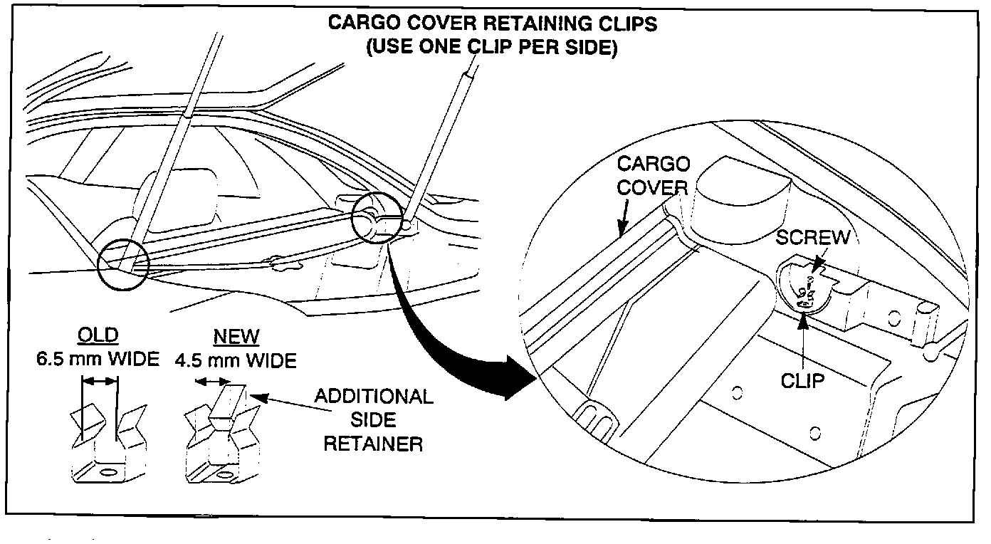 The new cargo cover retaining clip is 2 mm narrower than the old clip. In addition, for extra holding ability, the new clip has a side retainer. When the cargo cover rattle/looseness is discovered, replace both left and right retaining clips.