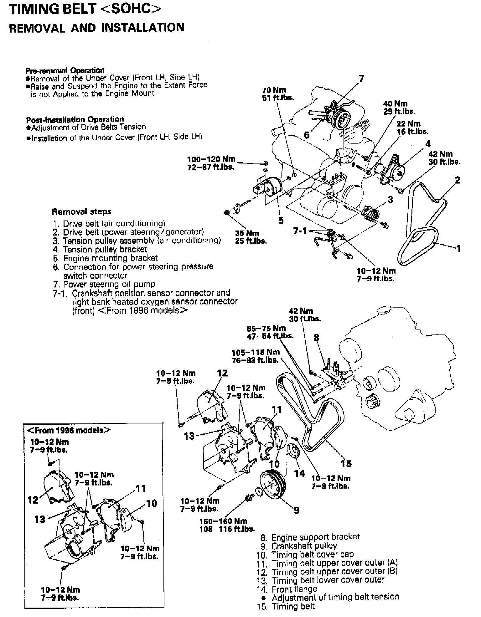 (c) Next run the timing belt onto the water pump pulley the camshaft sprocket on the front side, and the timing belt tensioner.