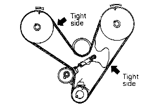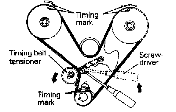 (d) Apply force counterclockwise to the camshaft sprocket on the rear side. When the tight side of the belt is fault check that the timing marks are all aligned.