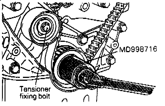 (d) Re-align the sprockets timing marks and tighten the tensioner fixing bolts.