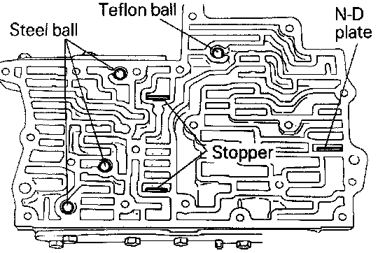 (1) Install the stopper plates, N-D plate, teflon ball, and steel balls into the upper valve body as shown.