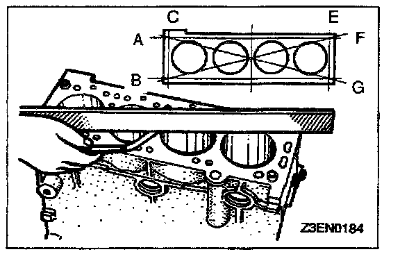 2. Using a straightedge and feeler gauge, check the block top surface for warpage. Make sure that the surface is free from gasket chips and other foreign matter.