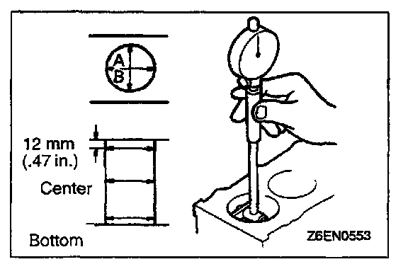 5. Using a cylinder gauge, measure the cylinder bore and cylindricity. If worn badly, correct the cylinder to an oversize and replace the piston and piston rings. Measure at the points shown in illustration.