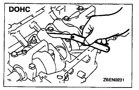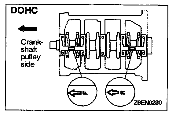 2. After installing the bearing caps, make sure that the crankshaft turns smoothly and the end play is correct. If the end play exceeds the limit, replace crankshaft bearings.