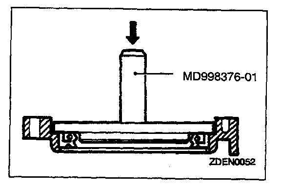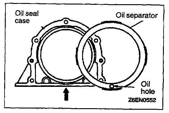 1. Force the oil separator into the oil seal case so that the oil hole in the separator is directed downward (arrow in illustration).